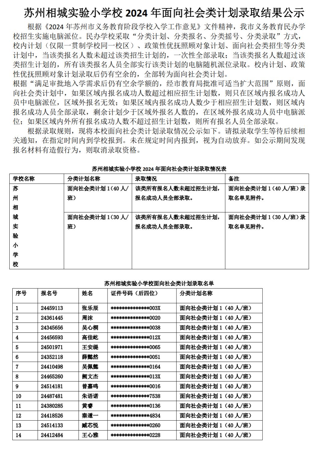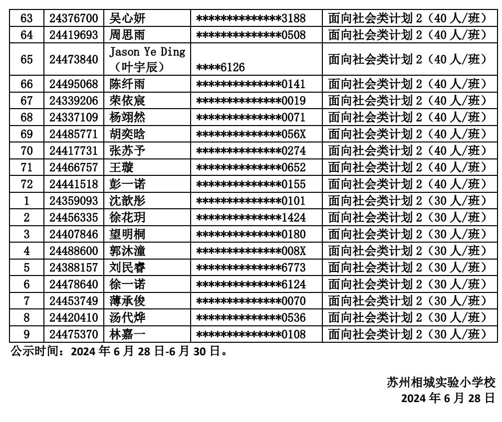 苏州相城实验小学校2024年面向社会类计划录取结果公示